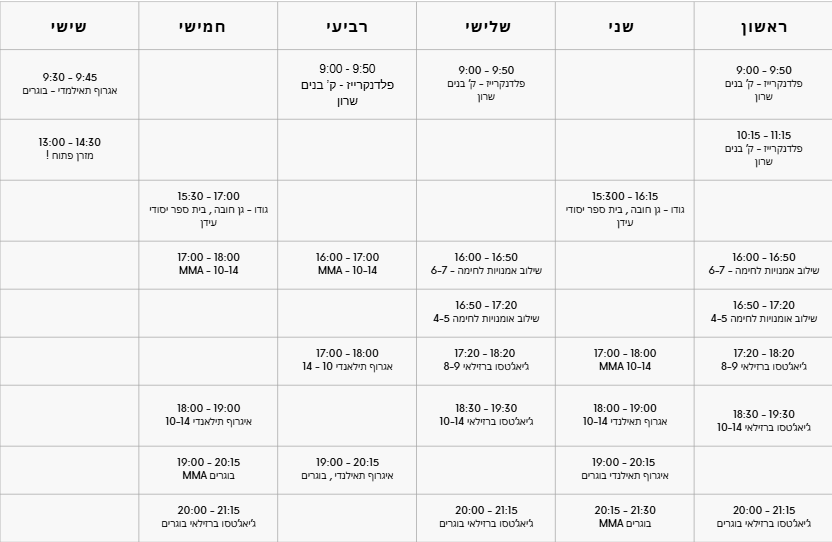 מערכת שעות מערכת שעות שבועית 2026 בואו להתאמן איתנו נרשמים לאימון ניסיון מעשיר ומהנה,מצטרפים לקבוצה ומתקדמים.לא מורידים את החיוך כל השנה. Please enable JavaScript in your browser to complete this form.שם פרטי ושם משפחה *כתובת מייל *מספר טלפון *פרטים נוספיםMessageSend Message